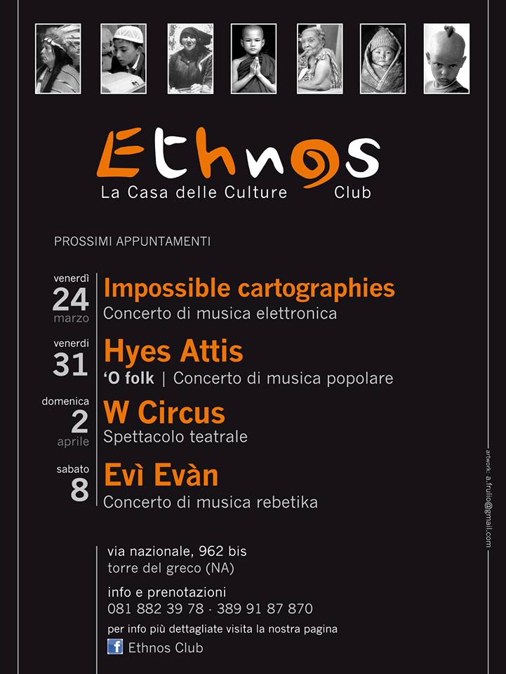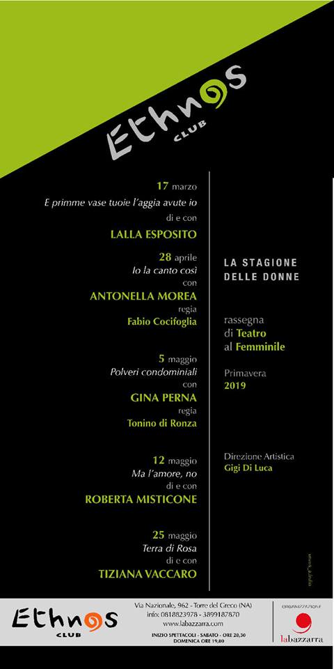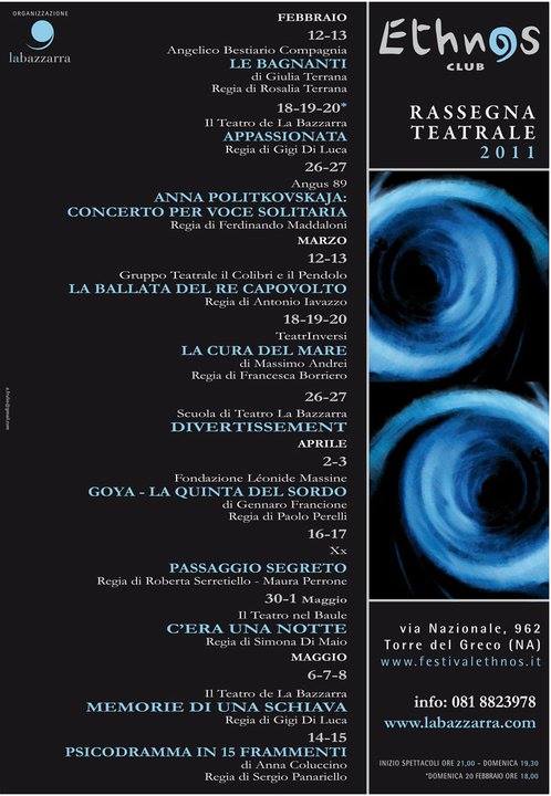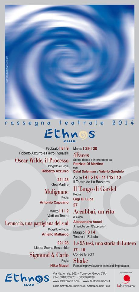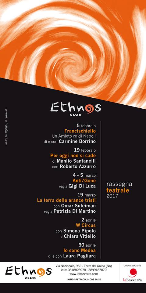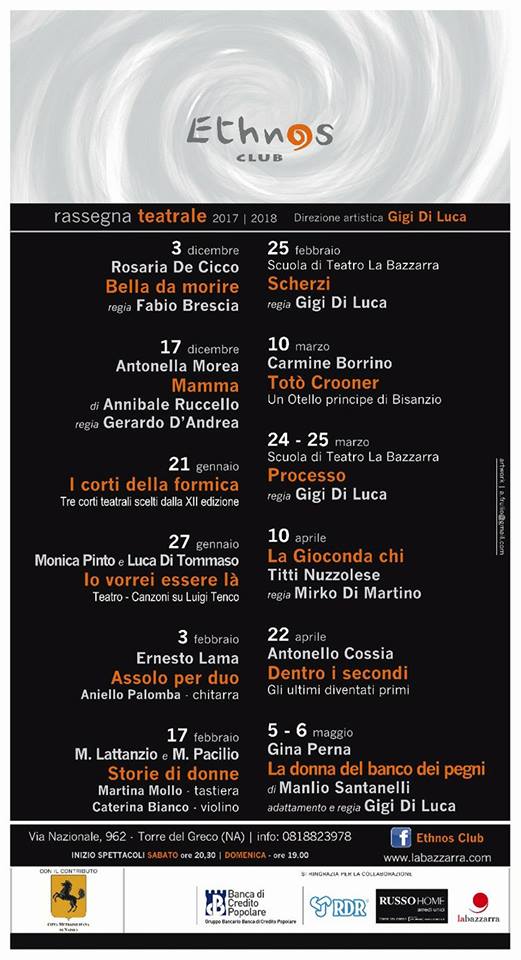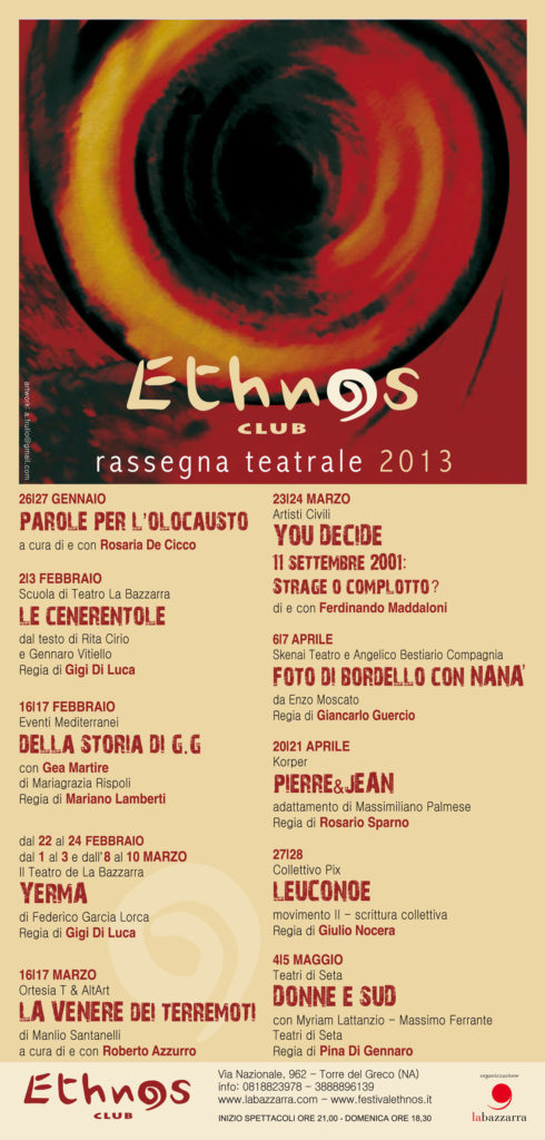Nel corso degli anni sul palco dell’Ethnos Club si sono succeduti spettacoli, concerti, eventi, teatro. Ricordiamo qua brevemente alcune delle iniziative portate avanti: Oscar Wilde, Il Processo progetto e regia di Roberto Azzurro; Mulignane con Gea Russo, da un racconto di Francesca Prisco, regia Antonio Capuano; Lenuccia con Maddalena Stornaiuolo, regia Aniello Mallardo; 4 Faces tratto da Alla meta di T. Bernhard, regia Patrizia Di Martino; Accabbai, un rito di e con Alessandra Asuni; Open – percorsi nei luoghi e nell’arte; Mi Chiamo Albert all’interno della rassegna Teatro in Fabula; Mi chiamo Albert, regia e drammaturgia Ramona Tripodi, con Stefano Ferraro; Coffee Brecht | Shake Teatro di improvvisazione.